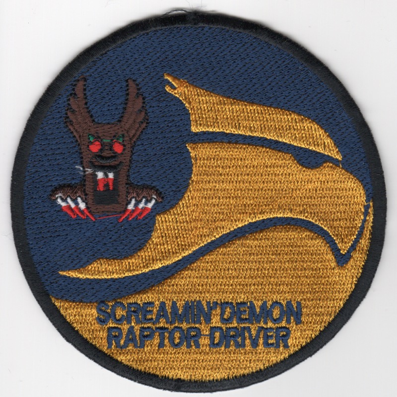 (Korean): The 7FS was reactivated on 15 May 2008 and equipped with the Lockheed- Martin F-22A Raptor. They were the first of two F-22 squadrons to be activated at Holloman AFB, NM. The squadron was equipped with 18 F-22s transferred from the 3d Wing at Elmendorf Air Force Base, Alaska, the last aircraft being received in late 2009. After its reactivation, the 7FS deployed frequently to overseas locations in support of US objectives and are better known as the “Screamin’ Demons”. Operating the F-22A Raptor, the squadron provided air dominance in the world’s most dangerous threat arenas. This is the “DARK YELLOW/BLACK” version of their “Raptor Driver” patch and was found in a Korean embroidery shop in very limited quantities. This patch does not come with velcro attached.