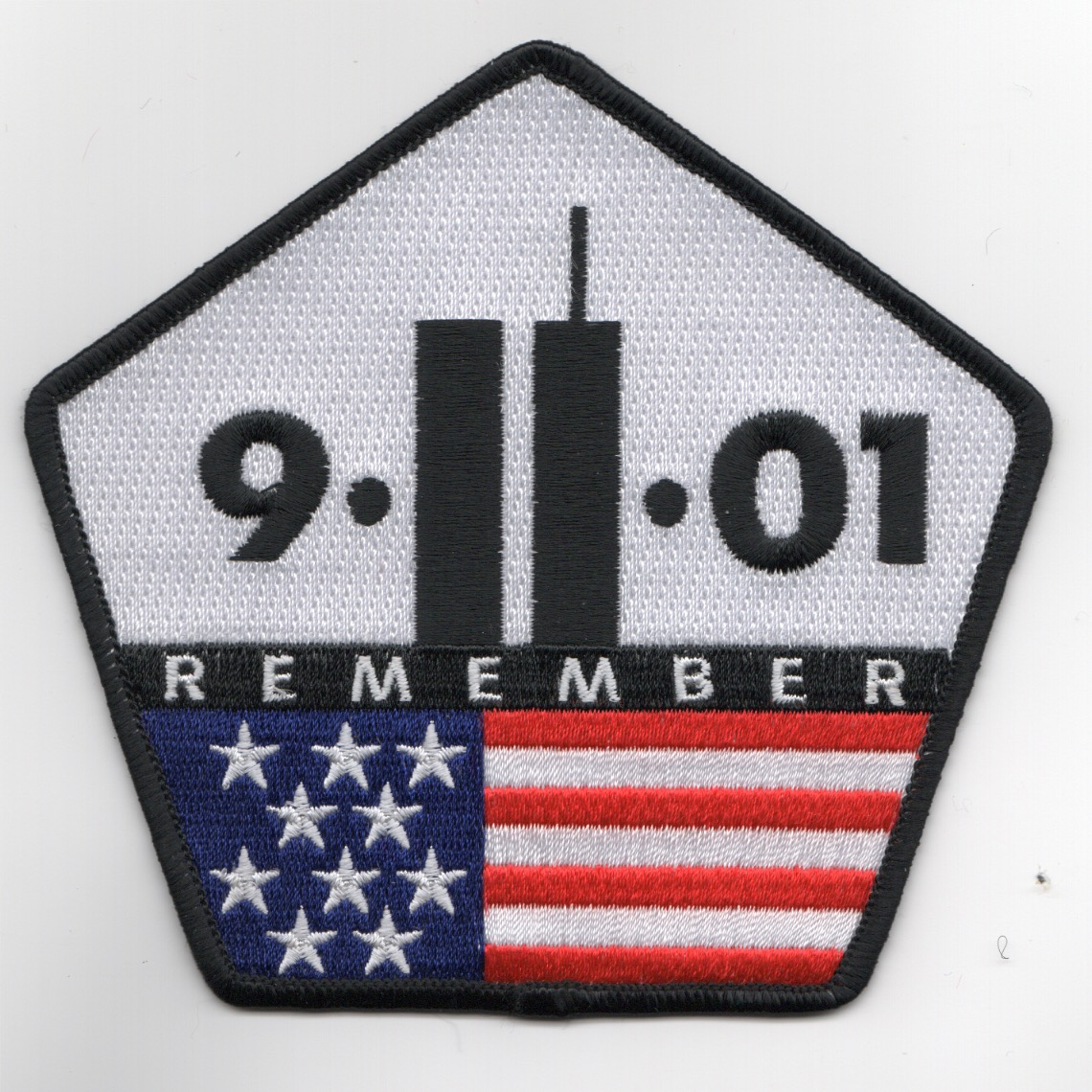 This is a 9-11 Memorial Patch. Very simple and elegant patch. It’s done in a pentagon shape with the twin towers forming the 11 in 9-11-01. It has the American flag at the bottom and states “”””REMEMBER”””” across the middle. This patch does not have velcro attached.