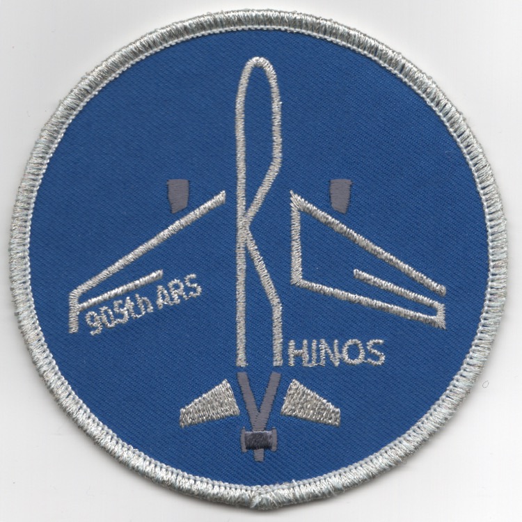 This is the blue version with the silver border of the ‘FRG’ patch for the 905th Air Refueling squadron. The 905th ARS is an inactive USAF unit, last active as an element of the 319th ARW at Grand Forks AFB, ND, where it operated Boeing KC-46 Pegasus aircraft. The squadron was inactivated at the end of 2010 when the 319th wing lost its operational mission and became the 319th Air Base Wing, but apparently has been reactivated(?). This patch does not have velcro attached.