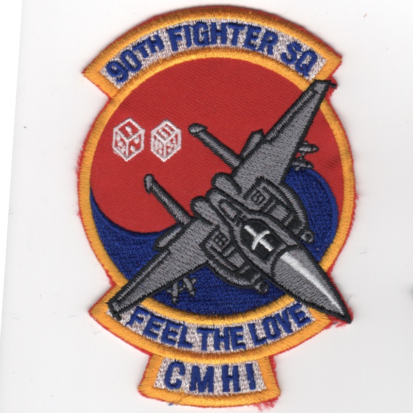 (Korean): The 90FS is a squadron of the USAF assigned to the 3d Operations Group, 3d Wing, Joint Base Elmendorf-Richardson, Alaska, Pacific Air Forces (currently). The squadron flew the mighty F-15E Strike Eagle for many years, but now is equipped with the F-22 Raptor. The 90FS is one of the oldest units in the USAF, first being organized as the 90th Aero Squadron on 20 August 1917 at Kelly Field, TX. The squadron deployed to France and fought on the Western Front during World War I as a Corps observation squadron. During World War II, the unit earned the Distinguished Unit Citation and the Presidential Unit Citation for its services in the Pacific Theater of Operations (PTO) as part of Fifth Air Force. During the Cold War the squadron fought in the Korean War and Vietnam War. This patch shows the Strike Eagle on a “Pair of Dice” and says “CMH” at the bottom (stands for “CHOW MY HOG”), was found in a Korean embroidery shop in very limited quantities and does not come with velcro attached.