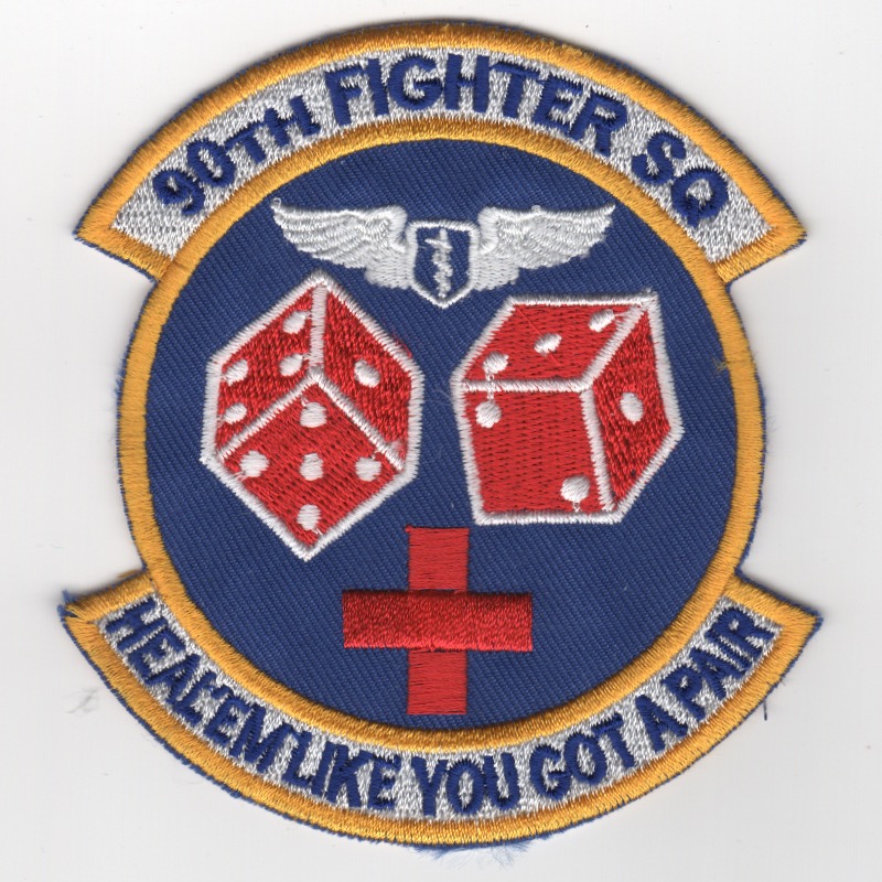 (Korean): The 90FS is a squadron of the USAF assigned to the 3d Operations Group, 3d Wing, Joint Base Elmendorf-Richardson, Alaska, Pacific Air Forces (currently). The squadron flew the mighty F-15E Strike Eagle for many years, but now is equipped with the F-22 Raptor. The 90FS is one of the oldest units in the USAF, first being organized as the 90th Aero Squadron on 20 August 1917 at Kelly Field, TX. The squadron deployed to France and fought on the Western Front during World War I as a Corps observation squadron. During World War II, the unit earned the Distinguished Unit Citation and the Presidential Unit Citation for its services in the Pacific Theater of Operations (PTO) as part of Fifth Air Force. During the Cold War the squadron fought in the Korean War and Vietnam War. This patch shows the Flight Surgeon wings, a Pair of Dice (represents a man’s “pair”, with the Red Cross underneath. This patch was found in a Korean embroidery shop in very limited quantities and does not come with velcro attached.