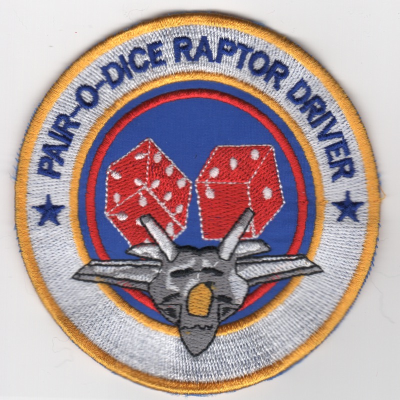 (Korean): The 90FS is a squadron of the USAF assigned to the 3d Operations Group, 3d Wing, Joint Base Elmendorf-Richardson, Alaska, Pacific Air Forces (currently). The squadron is now equipped with the F-22 Raptor. The 90FS is one of the oldest units in the USAF, first being organized as the 90th Aero Squadron on 20 August 1917 at Kelly Field, TX. The squadron deployed to France and fought on the Western Front during World War I as a Corps observation squadron. During World War II, the unit earned the Distinguished Unit Citation and the Presidential Unit Citation for its services in the Pacific Theater of Operations (PTO) as part of Fifth Air Force. During the Cold War the squadron fought in the Korean War and Vietnam War. This patch shows the ‘Raptor’ with a “Pair of Dice”, and says “PAIR-O-DICE RAPTOR DRIVER. It was found in a Korean embroidery shop in very limited quantities and does not come with velcro attached.