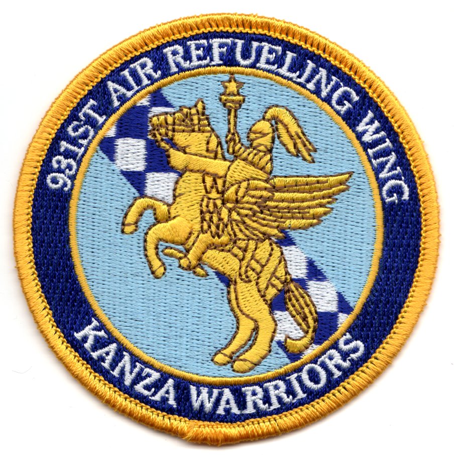 The 931st Air Refueling Wing (ARW) is an associate unit with the active-duty 22nd Air Refueling Wing (ARW) at McConnell AFB, KS. The 22nd ARW and 931st ARW share responsibilities for aircraft maintenance, with flying operations conducted by both units, using KC-135R Stratotankers. The 931st ARW began its heritage in January 1963 as a Troop Carrier Group, operating C-119 aircraft. Since then, the 931st has operated various aircraft, to include the U-3, O-2, A-37 and KC-135. The Group flew the KC-135 from 1978 as a component of the Air Force Reserve at Grissom AFB, IN, until its inactivation in 1987. Congress redesignated the 931st in September 1994. The 931st ARG activated at McConnell AFB in January 1995, becoming the first KC-135 associate tanker unit in the Air Force. Flying operations resumed in May 1995, refueling a B-2 bomber christened “Spirit of Kansas.”. This is the color (blue/yellow) version of their WING patch and does not have velcro attached.