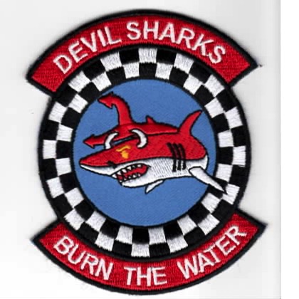 This is the *RED AIR* version of the squadron “Friday” patch for the Makos that fly the F-16 out of Homestead AFB, FL for the FL Air National Guard. It says *DEVIL SHARKS* (top), *BURN THE WATER* (bottom), with the red tabs indicative of the “BANDIT” role. This patch does not come with velcro attached.
