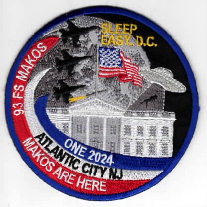This is the red/white/blue version of the “swirl” patch for the Makos that fly the F-16 out of Homestead AFB, FL for the FL Air National Guard. This patch says “SLEEP EASY, DC” (top), “MAKOS ARE HERE” (bottom), and does not come with velcro attached.