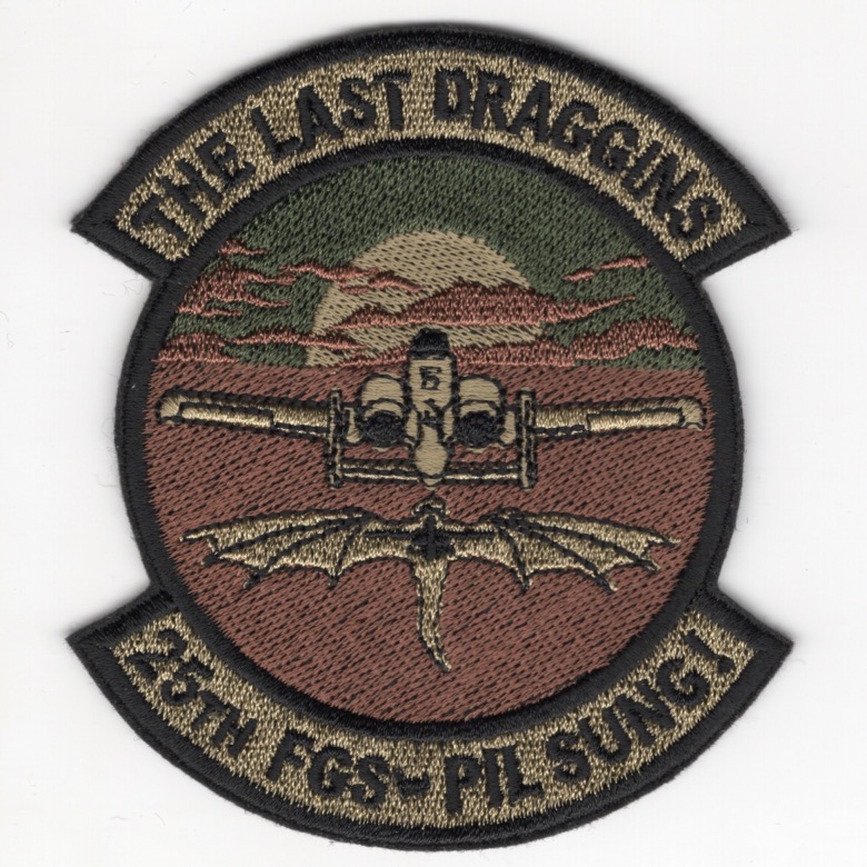 (From the Squadron supplier:) The 25FS is part of the USAF’s 51OG, 51FW, at Osan Air Base, South Korea. They operate the Fairchild Republic A-10 Thunderbolt II aircraft conducting close air support missions. On 28 January 1982, the 25FS received its first Fairchild Republic A-10 Thunderbolt II aircraft. The squadron’s presence helped maintain a peaceful armistice between North and South Korea until 2 October 1989. It was during that time that the 25th began transferring aircraft to the 19th Tactical Air Support Squadron and other stateside units. The 25th was then inactivated on 1 July 1990. On 1 October 1993, the 25FS was reactivated under the 51st Wing at Osan Air Base, Republic of Korea, and has since added six A-10 aircraft to its fleet, making it a dual qualified A/OA-10 squadron. This is the OCP version of the “THE LAST DRAGGINS / PILSUNG” patch depicting the “Green Dragon” following the A-10 as it flies into the sunset. This patch was found in a Korean embroidery shop in very limited quantities and does not come with velcro attached.