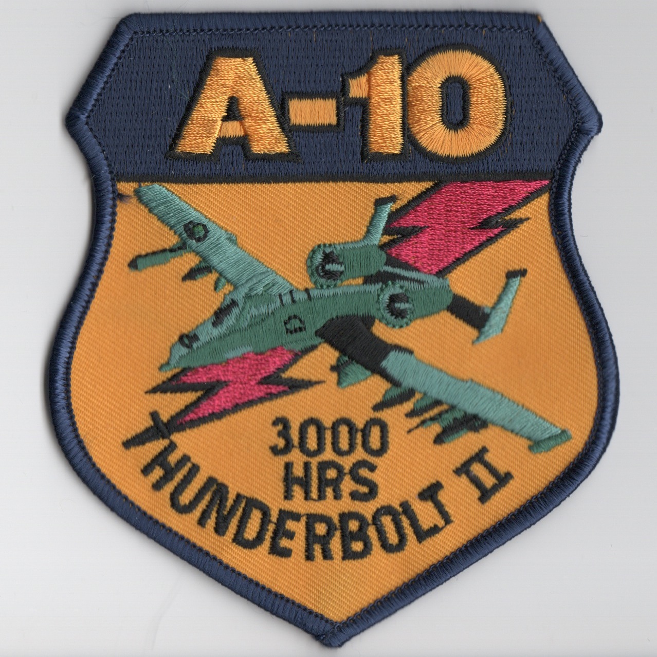 This is the 3000 Hours crest patch for the mighty A-10 Warthog/Thunderbolt II. It depicts the green-camoflauged aircraft.