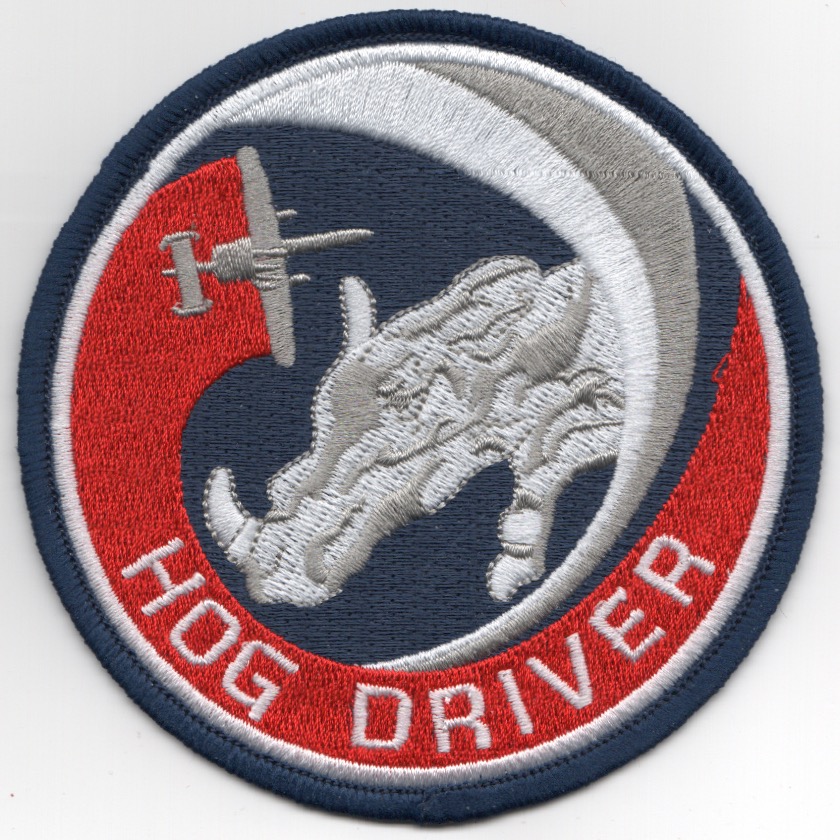 This is the A-10 Warthog’s takeoff from the “other” fighter squadrons “driver” patches. This one states ‘HOG DRIVER’ and has the same Red/White/Blue swirl, and does not come with velcro attached.