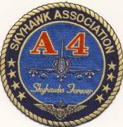 This is a round patch for the “”””Skyhawk Association”””” for A-4s. It has a gold rope edge. It shows an A-4 in the middle and states “”””Skyhawks Forever””””. It has navy pilot wings near the bottom of the patch and does not come with velcro attached.