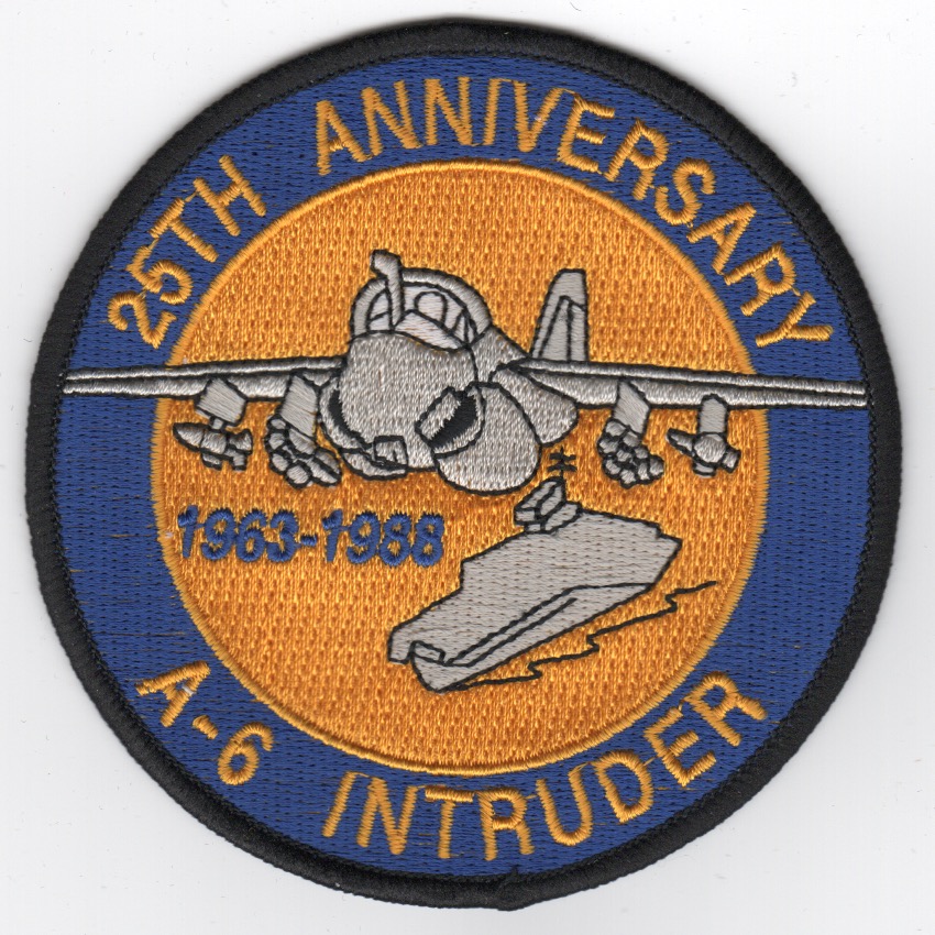 This is the 25th Anniversary patch created for the A-6 Intruder community. It has the dates 1963 – 1988 and this patch was picked up at the 2018 Intruder Reunion from one of the Bombardier/Navigators present that had a shoebox full of them, therefore I am assuming this is an authentic patch from the 1988 era. This patch does not have velcro on it.