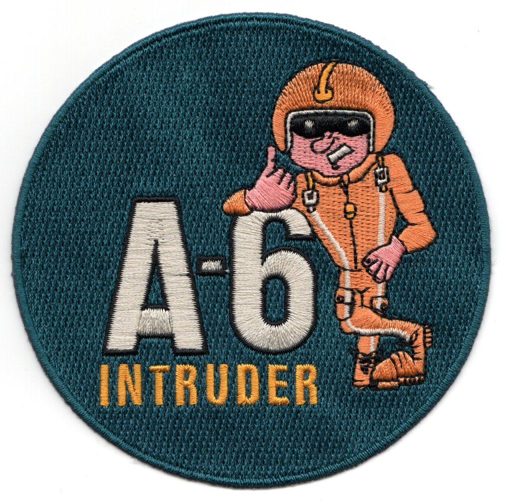 (AV8RSTUFF Reproduction): This is the famous ‘INTRUDER-man’ patch created during the early days of the A-6 introduction. It shows one of the flyers leaning on the Designator and does not come with velcro attached.