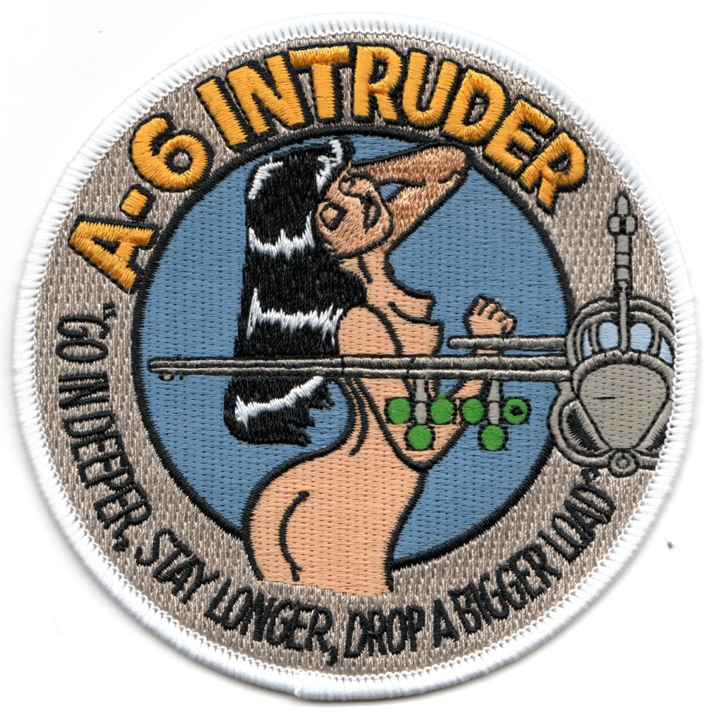 (Another AV8RSTUFF Creation): This is created from one of the Intruder Bubbas (he shall remain nameless to protect him….ha ha), but shows the venerable Intruder on the right of the patch with a very BEAUTIFUL and NAKED woman with our motto from those days that says “GO IN DEEPER, STAY LONGER, DROP A BIGGER LOAD” along the bottom. This patch does not have velcro.