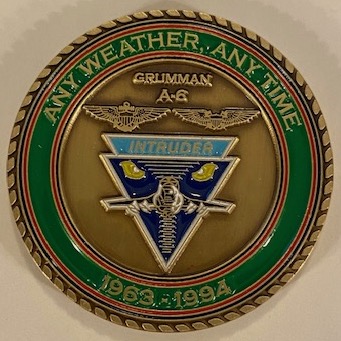 Another AV8RSTUFF creation: This is the A-6E / VA-42 GREEN PAWNS Intruder ‘Challenge Coin’ with the Squadron logo on the front (seen here) and the A-6E Intruder info/logo on the back (below).