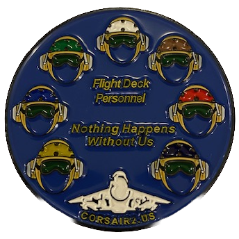 The flight deck crew of an aircraft carrier includes specialized sailors who manage aircraft operations and are identified by the color of their jerseys / cranials. This is the front of the coin (seen here) and the back of the coin can be seen below.
