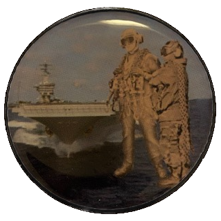 The flight deck crew of an aircraft carrier includes specialized sailors who manage aircraft operations and are identified by the color of their jerseys / cranials. This is the front of the coin (seen here) and the back of the coin can be seen below.