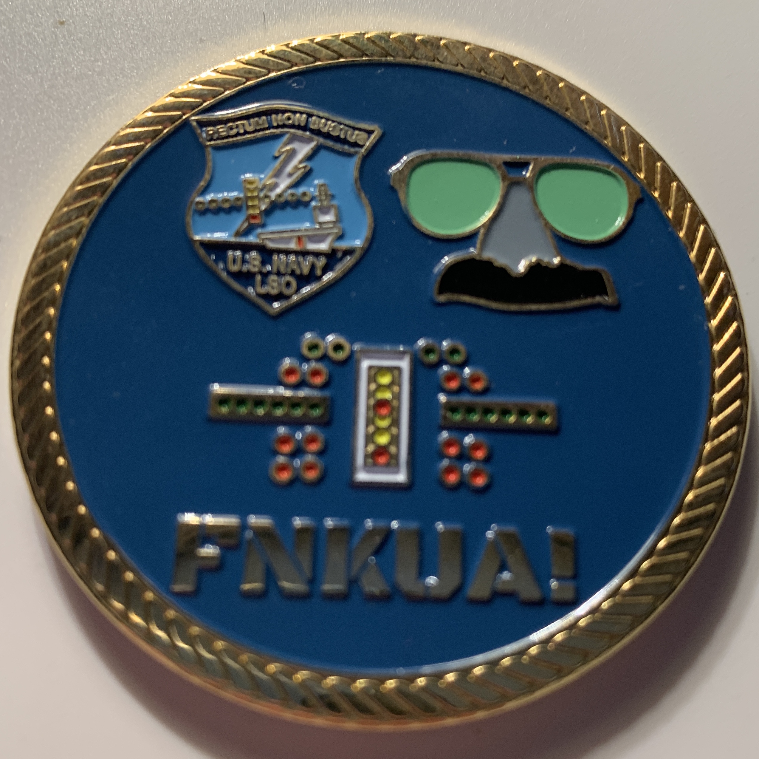 Another “IRISH””” creation: This is the commemorative ‘Challenge Coin’ created for CDR John J. ‘BUG’ Roach’s career. CDR Roach was the Navy’s senior LSO. He “waved” more aircraft than any other LSO in the Navy (over 130,000 landings). Recognizing CDR Roach’s enormous contribution to naval aviation, the Northern California Coastal Navy League established the Commander John “Bug” Roach Paddles Award for LSO excellence. There is a picture of him on the front (seen here) and the back of the coin can be seen below.