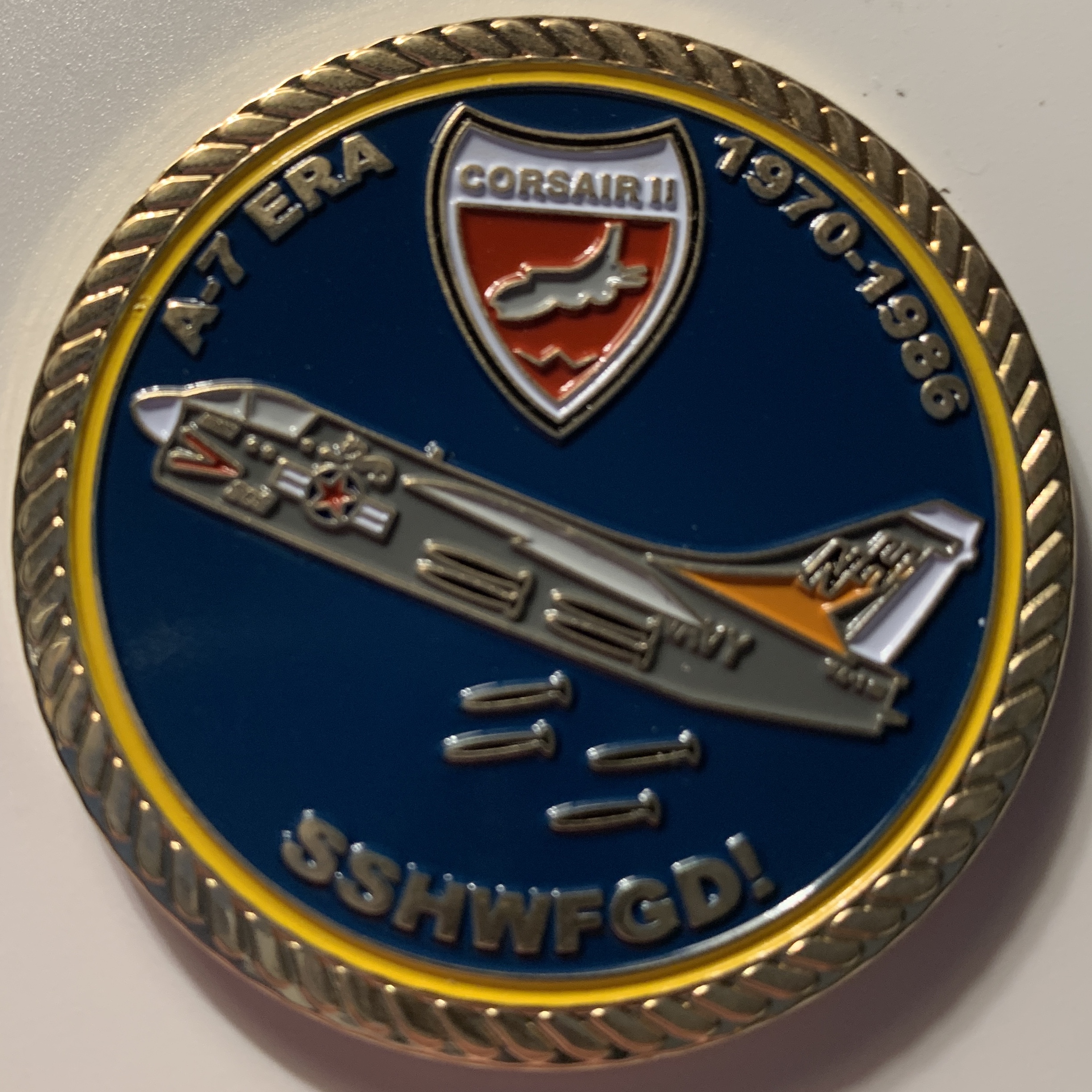 Another “”””IRISH”””” creation: This is the A-7E Corsair / VA-192 ‘WORLD FAMOUS GOLDEN DRAGONS’ Challenge Coin with the Squadron logo on the front (seen here) and the venerable A-7E and other misc logos/years of service on the back (below).