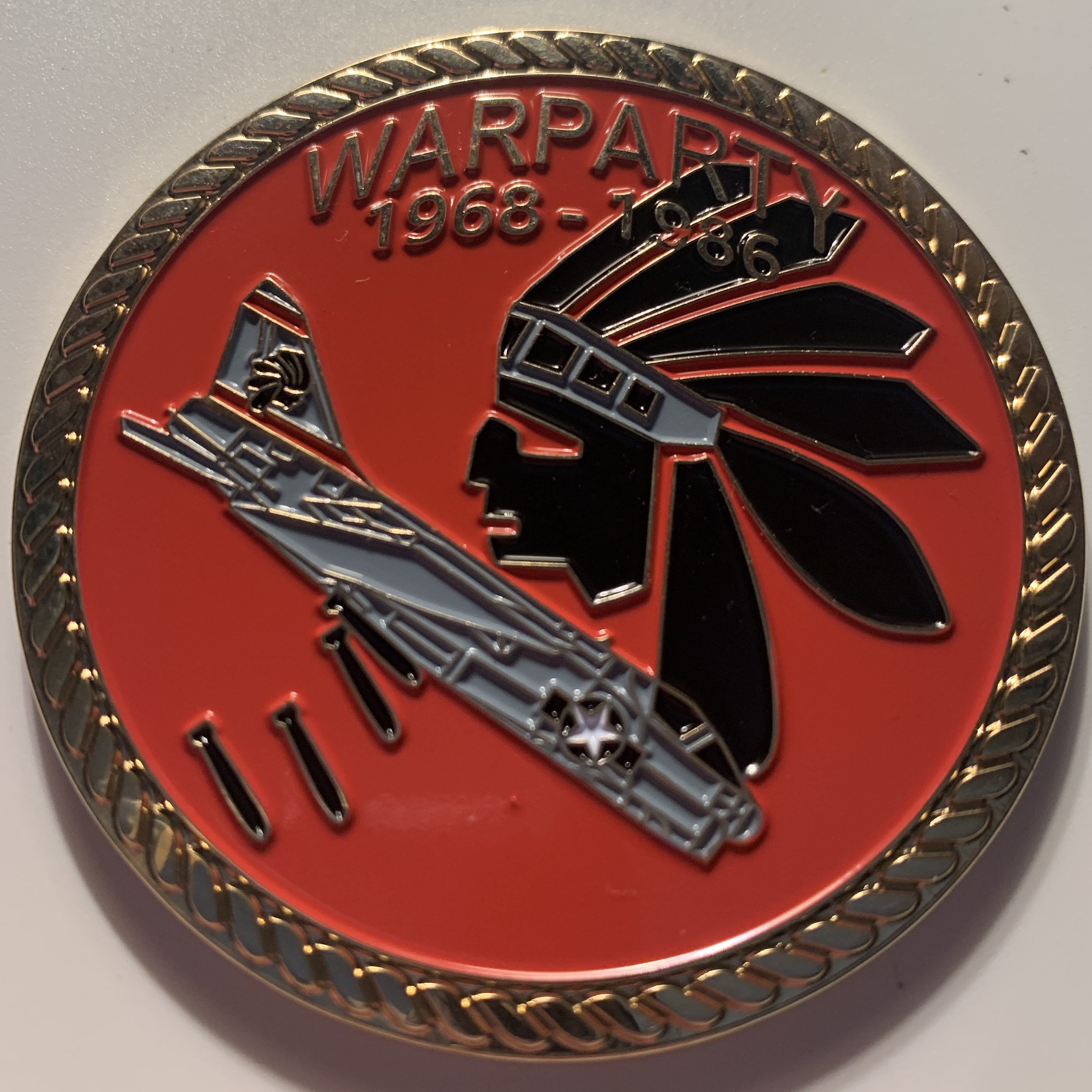 Another “”””IRISH”””” creation: This is the A-7E Corsair / VA-87 ‘GOLDEN WARRIORS’ Challenge Coin with the Squadron logo on the front (seen here) and the venerable A-7E and other misc logos/years of service on the back (below).