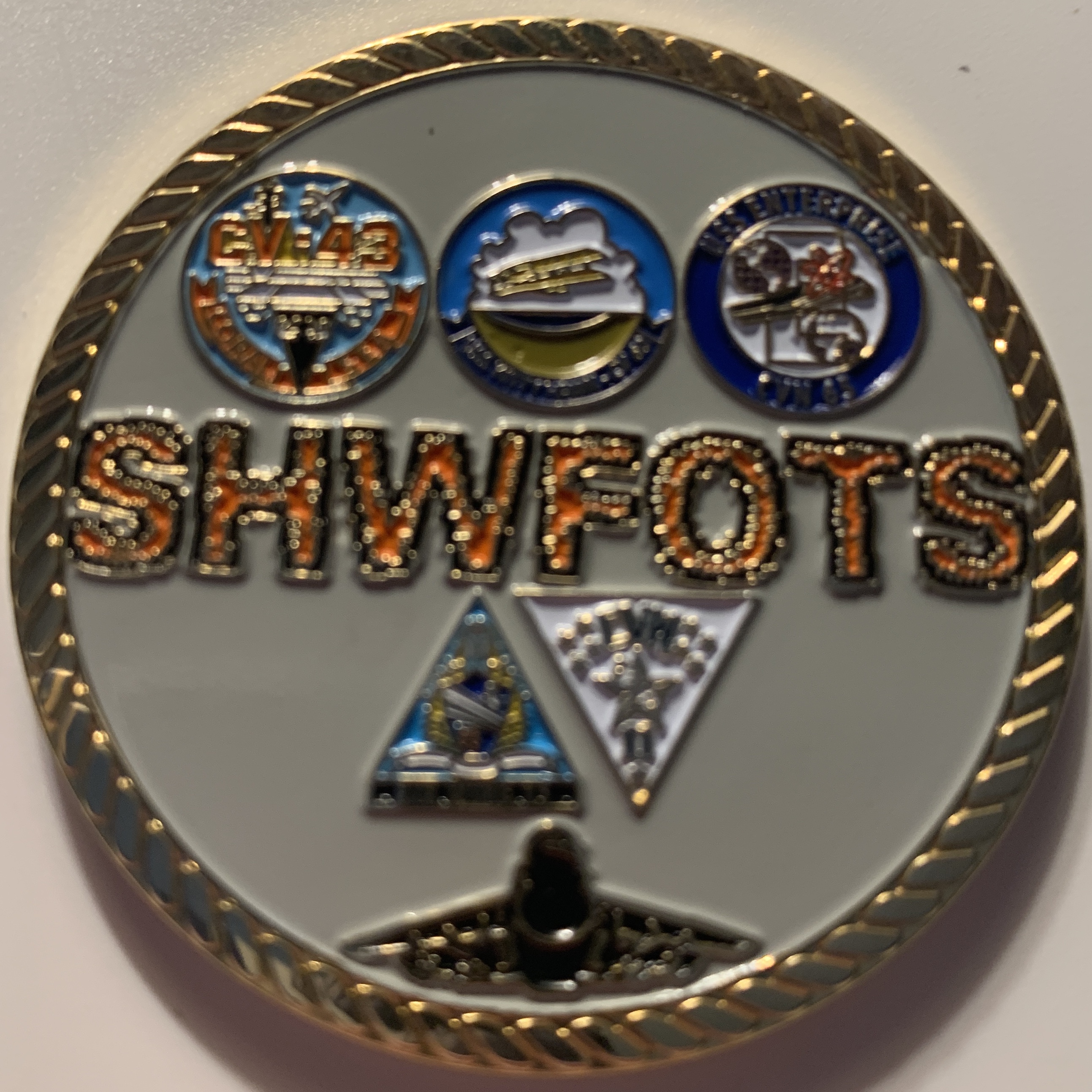 Another “”””IRISH”””” creation: This is the A-7E Corsair / VA-94 ‘MIGHTY SHRIKES’ Challenge Coin with the Squadron logo on the front (seen here) and the venerable A-7E and other misc logos/years of service on the back (below).