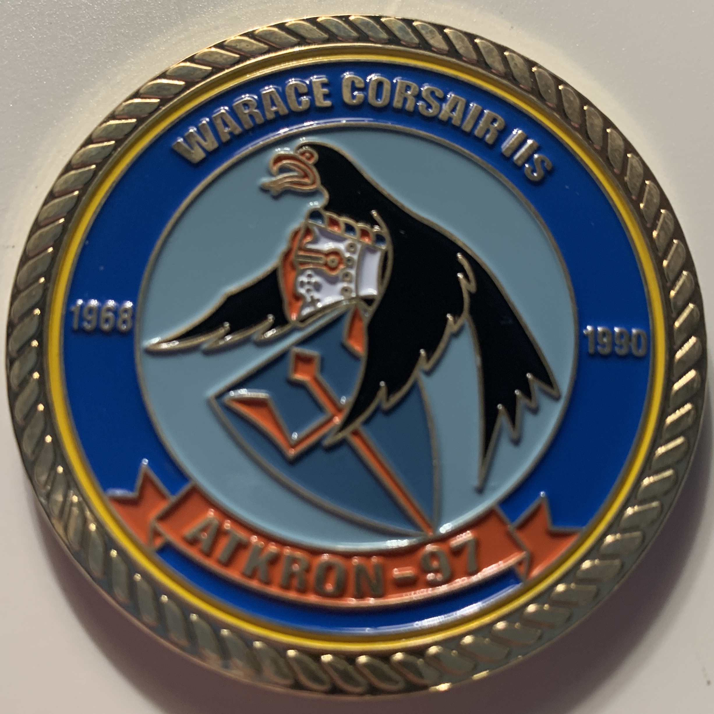 Another “”””IRISH”””” creation: This is the A-7E Corsair / VA-97 ‘WARHAWKS’ Challenge Coin with the Squadron logo on the front (seen here) and the venerable A-7E and other misc logos/years of service on the back (below).