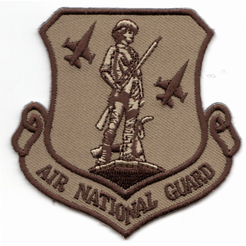 This is the desert version of the Air National Guard patch. It shows the famous “Minuteman” in the center with the words “Air National Guard” across the bottom and F-16s in flight in the background. This is for the flightsuit, NOT the leather jacket (it doesn’t have a leather border) and does NOT have velcro attached.