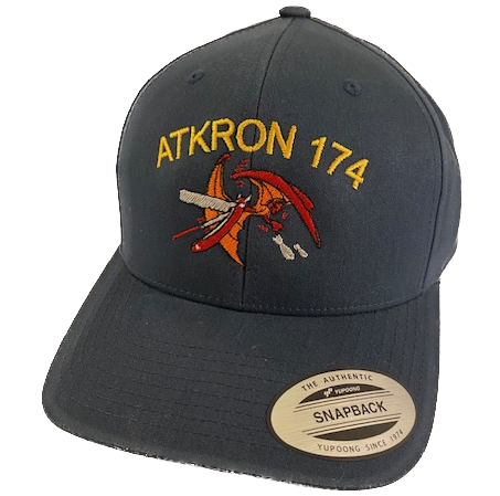 (Ballcap): Attack Squadron 174 (VA-174) also known as the “Hellrazors” was a US Navy attack squadron based at NAS Cecil Field, FL and were attached to Light Attack Wing One. It was commissioned from 1944 to 1988. The unit has evolved several times throughout its history that dates back to 1944. When it was established in March 1944, the unit was designated VB-81 flying the SB2C Helldiver. It was redesignated VA-13A on 15 November 1946. The unit was redesignated VA-134 on 2 August 1948 flying F-4U Corsairs, and redesignated VF-174 on 15 February 1950. The Hellrazors received their final designation VA-174 on 1 July 1966 after becoming the first US Navy squadron to receive the A-7A Corsair II. It was the second squadron to bear the VA-174 designation, the first VA-174 was disestablished on 25 January 1950. The squadron was disestablished on 30 June 1988. The nickname “Hell Razors” was conceived by Walt Disney Studios, which also created the squadron’s insignia, a caricature of an imaginary bat-like, razor-beaked creature from Hell, embodying the qualities of ferocity, determination, and a razor sharp skill in the use of aircraft and airborne weapons. This is the dark blue version with “HELLRAZORS” embroidered on the back and has a plastic adjustable strap.
