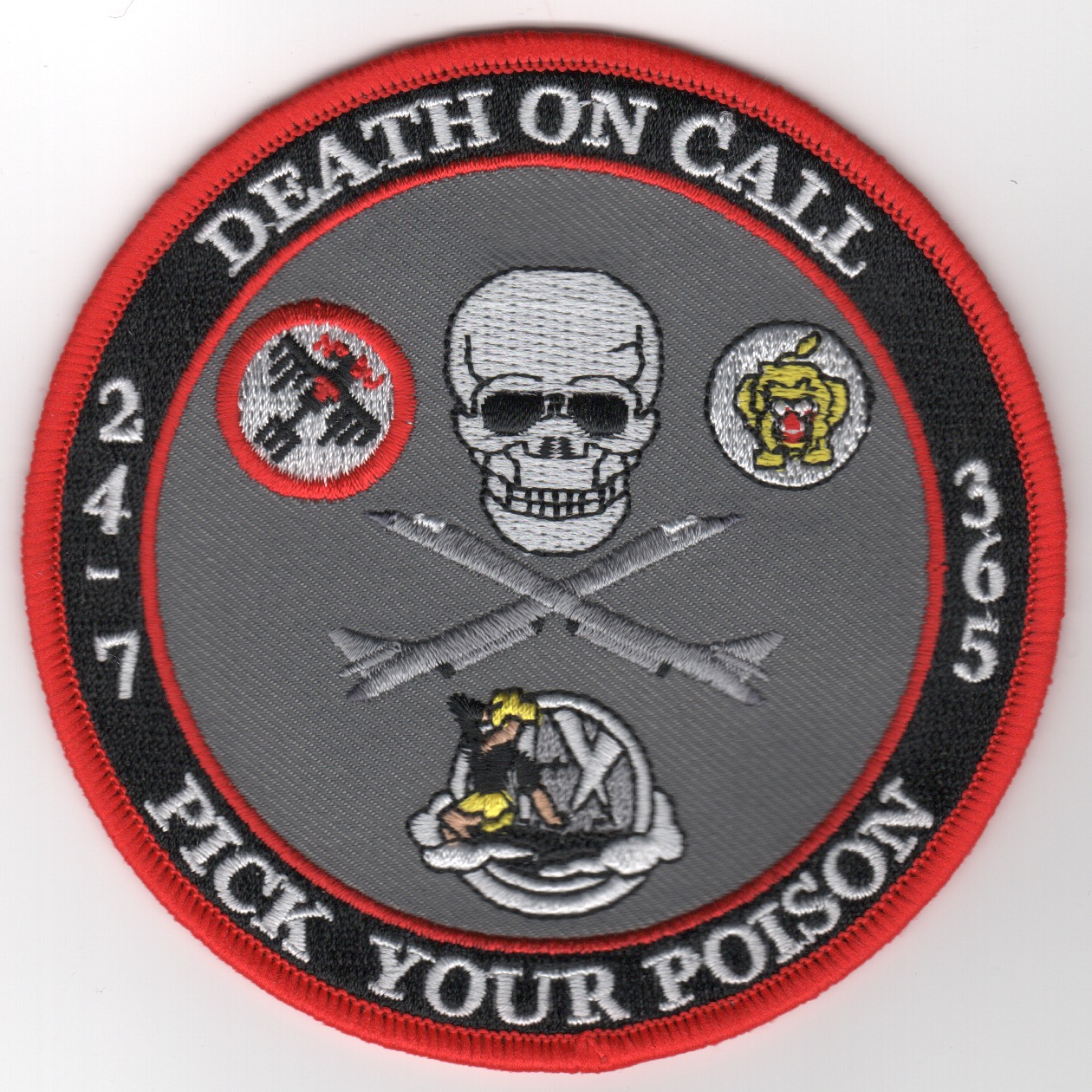 The is a B-1B ‘gaggle’ patch that depicts 3 Bone units. On the sides of the patch it says “24-7, 365”. On the top of the patch it states, “Death On Call” and along the bottom, “Pick Your Poison”. It does not come with velcro attached.