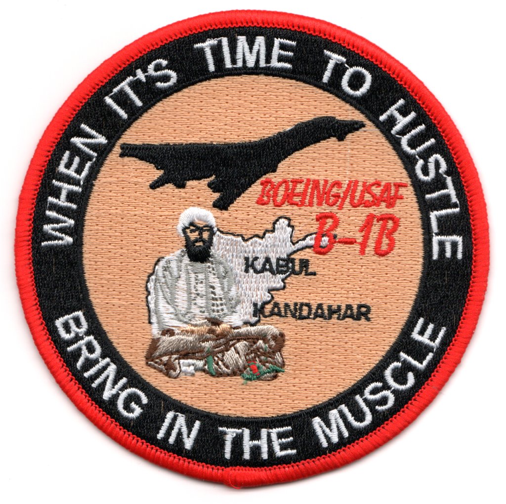 This is the (not as) famous B-1B “AFGHAN Hustle” patch that says “WHEN IT’S TIME TO HUSTLE” (top), “BRING IN THE MUSCLE” (bottom), has OSAMA BIN LADEN sitting in his cave outside of Kandahar with a BONE hovering overhead ready to drop on his ass….this patch doesn’t have velcro.