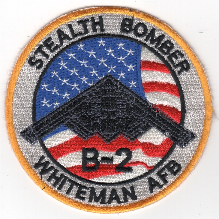 The Northrop (later Northrop Grumman) B-2 Spirit, also known as the Stealth Bomber, is an American heavy penetration strategic bomber, featuring low observable stealth technology designed for penetrating dense anti-aircraft defenses; it is a flying wing design with a crew of two. The bomber can deploy both conventional and thermonuclear weapons, such as eighty 500Êlb (230Êkg)-class (Mk 82) JDAM Global Positioning System-guided bombs, or sixteen 2,400Êlb (1,100Êkg) B83 nuclear bombs. The B-2 is the only acknowledged aircraft that can carry large air-to-surface standoff weapons in a stealth configuration. I found this colored version of this patch in a Korean embroidery shop, has the ‘theater-made’ feel to it with a ‘ cut-edge’ border and ‘FLAG’ background, and does not have velcro attached.