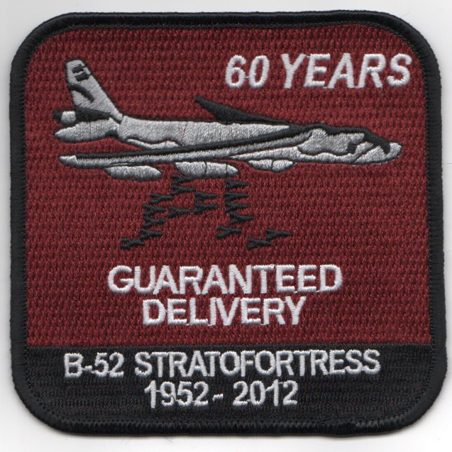 This is the 60th Anniversary patch for the B-52 Stratofortress…..1952-2012. It states ‘GUARANTEED DELIVERY’ with the dates underneath…..amazing! This patch does not have velcro attached.