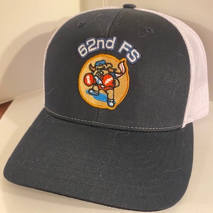 (From Squadron): The 62d Fighter Squadron is part of the USAF 56th Operations Group at Luke AFB, AZ. It operates the Lockheed Martin F-35A Lightning II aircraft conducting advanced fighter training. This is the zap/sticker they put on their binders/cars, etc. They “ramped up” their inventory for the upcoming air show season, but with the “Virus”, all airshows were put on hold, so we’re helping them out by paying a little more than normal to help their SNACK-O FUND stay solvent. This ballcap has the black brim and white mesh back.