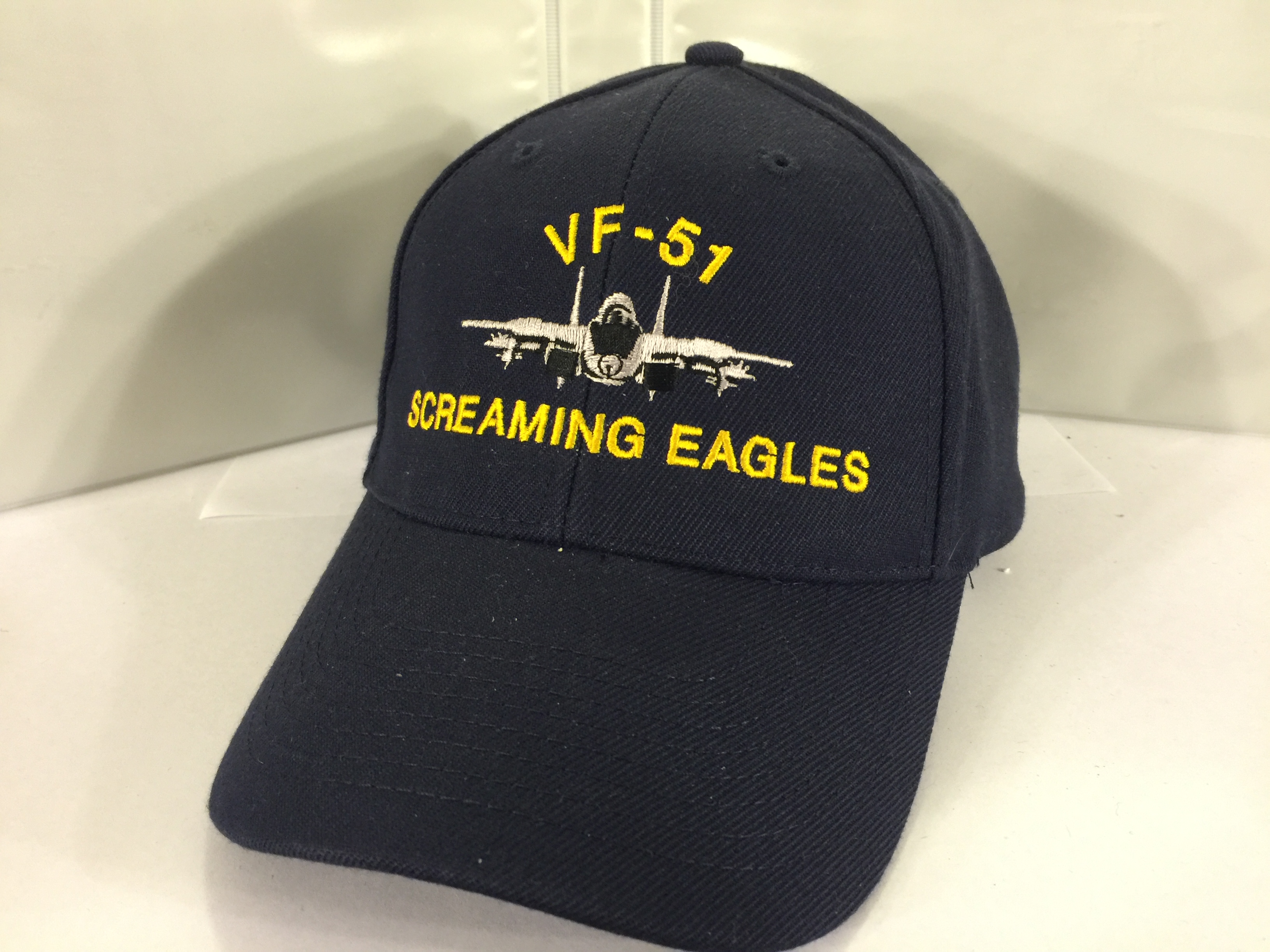 This is the dark blue/navy wool version with the plastic adjustable strap in the back that has the VF-51 *SCREAMING EAGLES* squadron name and frontal view of the F-14 Tomcat embroidered directly onto the front of the cap.