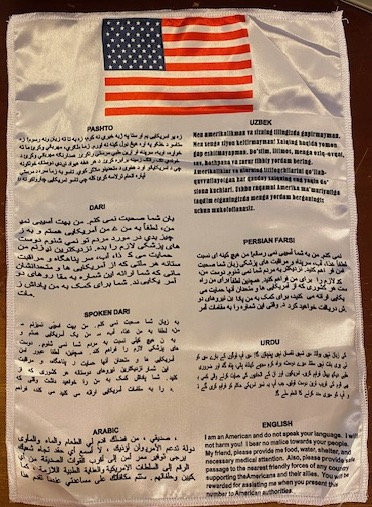 A blood chit is a notice carried by military personnel and addressed to any civilians who may come across an armed-services member Ð such as a shot-down pilot Ð in difficulties. As well as identifying the force to which the bearer belongs as friendly, the notice displays a message requesting that the service member be rendered every assistance. This chit was created for those flyers during the Vietnam War, displaying 14 different languages that might be spoken in the area the military member was operating. This is a silk, reproduction chit, and looks great sewn inside the flight jackets. This one was used mainly in Operation ENDURING FREEDOM, as it has multiple local languages, but mainly PASHTO and UZBEK.