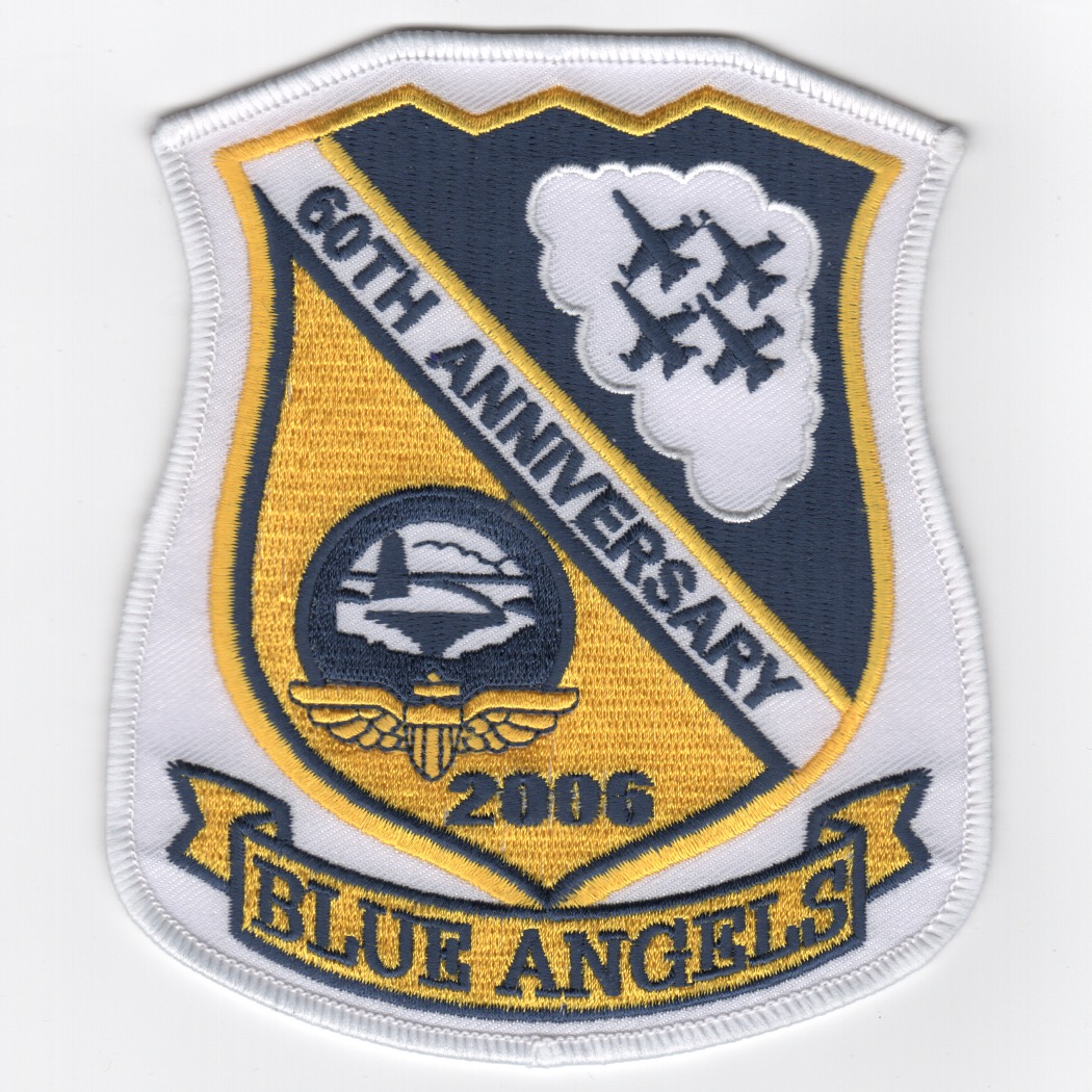 This is the 60th Anniversary patch for the US Navy’s elite demonstration team, the Blue Angels. Based out of NAS Pensacola, FL, the Blue Angels are the premiere Demonstration Team in existence today (althought they are all pretty damn good!). This patch commemorates 60 years of exhibitions performed by the elite Naval Aviators and has the F-18 Hornet planform in the upper right corner with the year 2006. This patch does not have velcro attached.