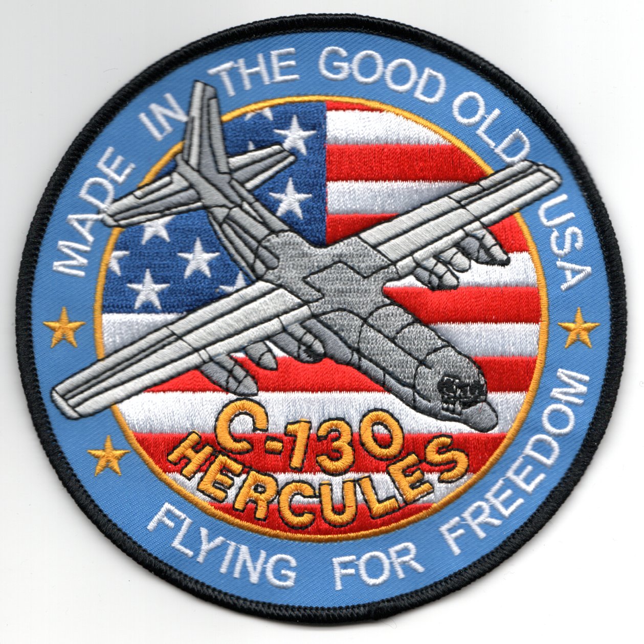 This is the r-w-b version of the aircraft patch for the C-130 “Hercules”, and has the motto “Made in the Good Old USA” along the top and “Flying for Freedom” along the bottom. This patch does not come with velcro attached.