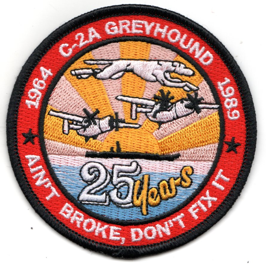 This is the “25-year anniversary” patch for the C-2 “GREYHOUND” Carrier Onboard Delivery (C.O.D.) Aircraft that has the years (1964 – 1989). It says “Ain’t Broke, Don’t Fix It” along the bottom and does NOT come with velcro already attached.