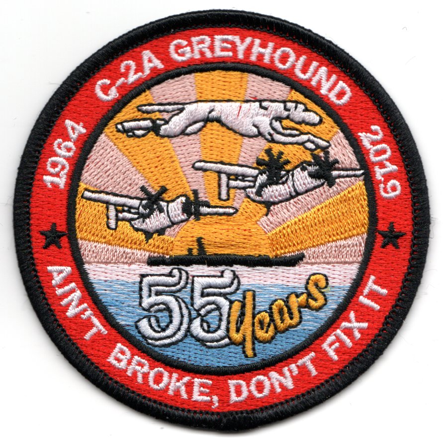 This is the “55-year anniversary” patch for the C-2 “GREYHOUND” Carrier Onboard Delivery (C.O.D.) Aircraft that has the years (1964 – 2019). It says “Ain’t Broke, Don’t Fix It” along the bottom and does NOT come with velcro already attached.