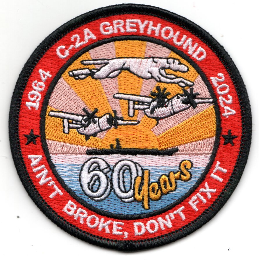 This is the “60-year anniversary” patch for the C-2 “GREYHOUND” Carrier Onboard Delivery (C.O.D.) Aircraft that has the years (1964 – 2024). It says “Ain’t Broke, Don’t Fix It” along the bottom and does NOT come with velcro already attached.