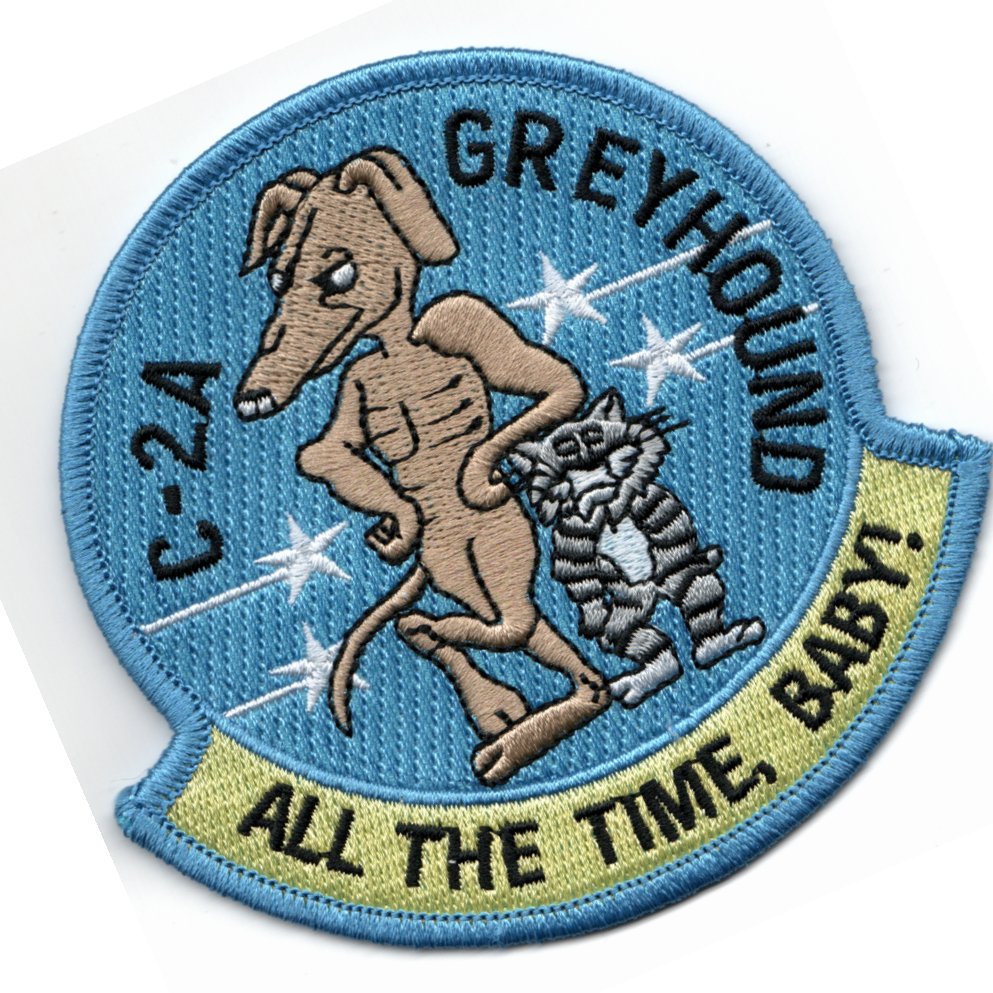 This is the C-2A Greyhound patch showing a greyhound (dog) leaning on the cranium of Felix (the F-14 Tomcat). It states “”””all the time baby”””” across the bottom rocker and does not have velcro attached.