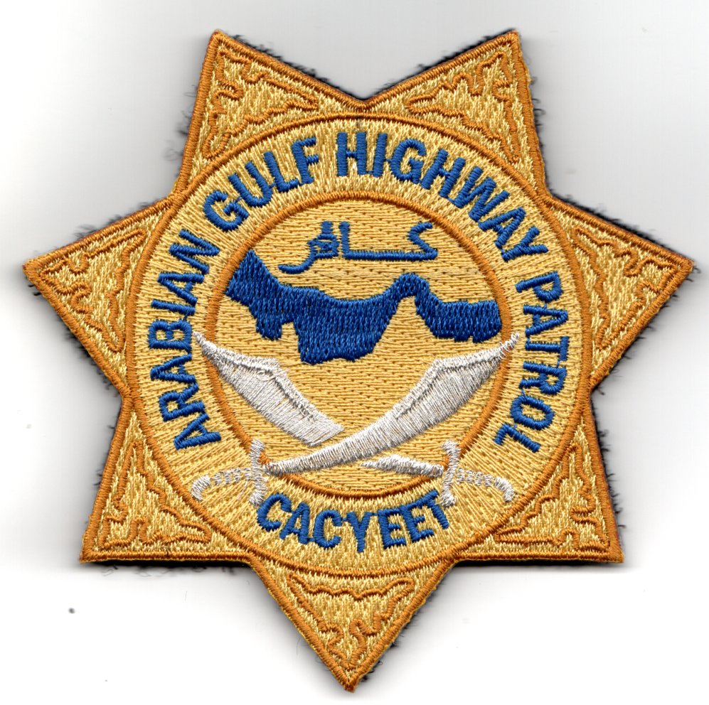 (Another AV8RSTUFF Creation): This patch was created for the CAC-7 DET forward deployed to a Middle Eastern location. It says ARABIAN GULF HIGHWAY PATROL (top), CACYEET (bottom), and has the SILVER crossed swords. This patch does come with velcro attached.