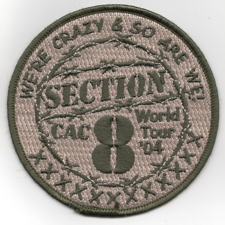 This patch was created by the USN Maritime Patrol (VP) community’s CAC-8 that flew the P-3 Orion aircraft in their anti-submarine mission. It is the desert-background version of their CAC-‘SECTION’-8 patch for their 2004 ‘World Tour’ and says “”””We’re Crazy & So Are We””””. This patch does not come with velcro attached.
