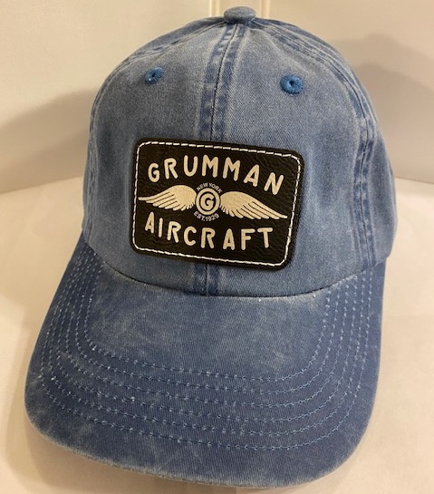 (Direct from supplier): This is the light(er) blue version of the GRUMMAN AIRCRAFT patch we obtained from the Grumman Factory Supplier. It has the GRUMMAN logo emblazoned on a leather patch, then the patch is sewn onto the front of the cap. There is a cloth strap on the back for adjusting.