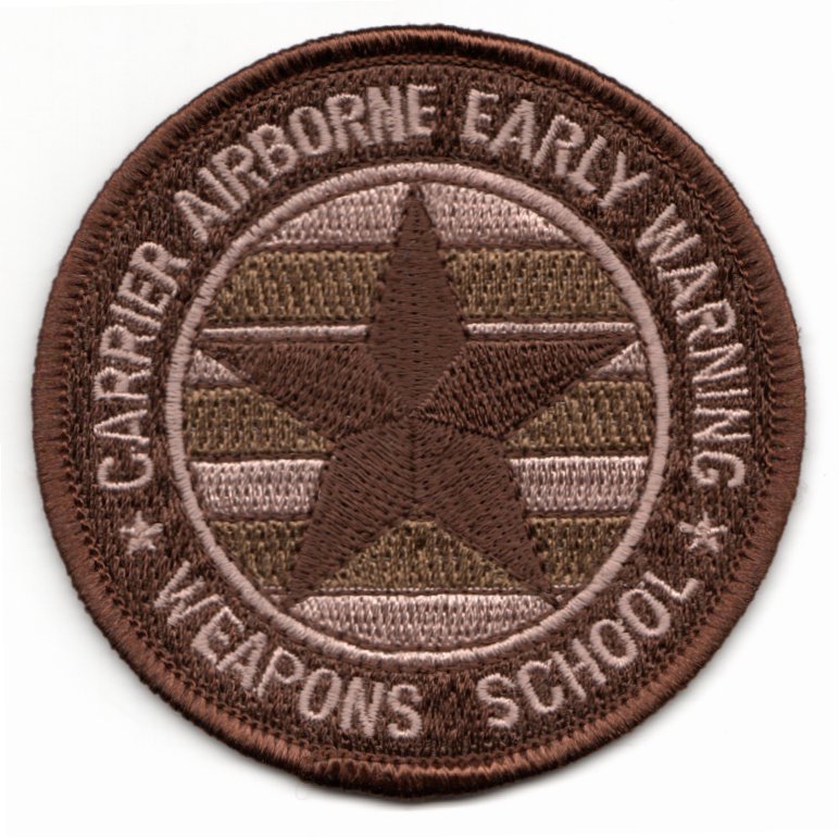 (Direct from the squadron): This is one of the versions created for the Carrier Airborne Early Warning (AEW) Weapons School. It depicts a desert star (centered) and is earned by those from the E-2 Community that graduate from this very prestigious school. It says “”””CARRIER AIRBORNE EARLY WARNING”””” (top) and “”””WEAPONS SCHOOL”””” (bottom) and does not have velcro attached.