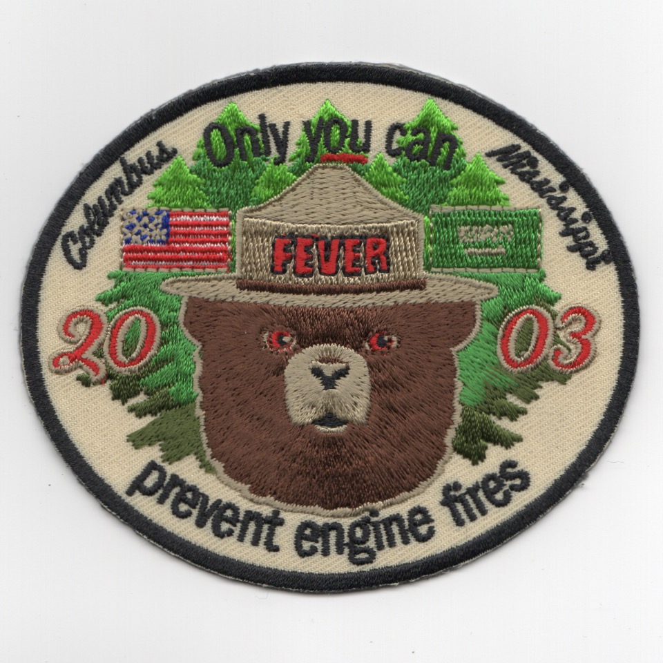 This is one of the class patches for the Columbus AFB UPT class 20-03. It shows ‘Smokey The Bear’ in the center and says “”””ONLY YOU CAN PREVENT ENGINE FIRES””””. This patch does not come with velcro attached.