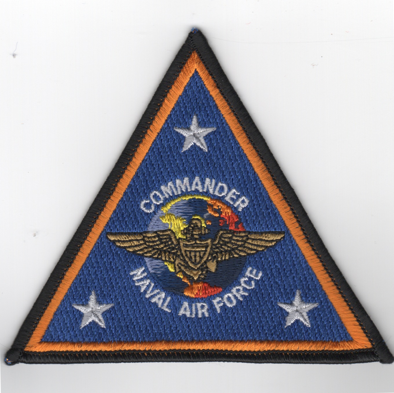 This is the color version of the COMMANDER, NAVAL AIR FORCE triangular patch. It shows a set of pilot wings superimposed on the world. This patch does not come with velcro attached.