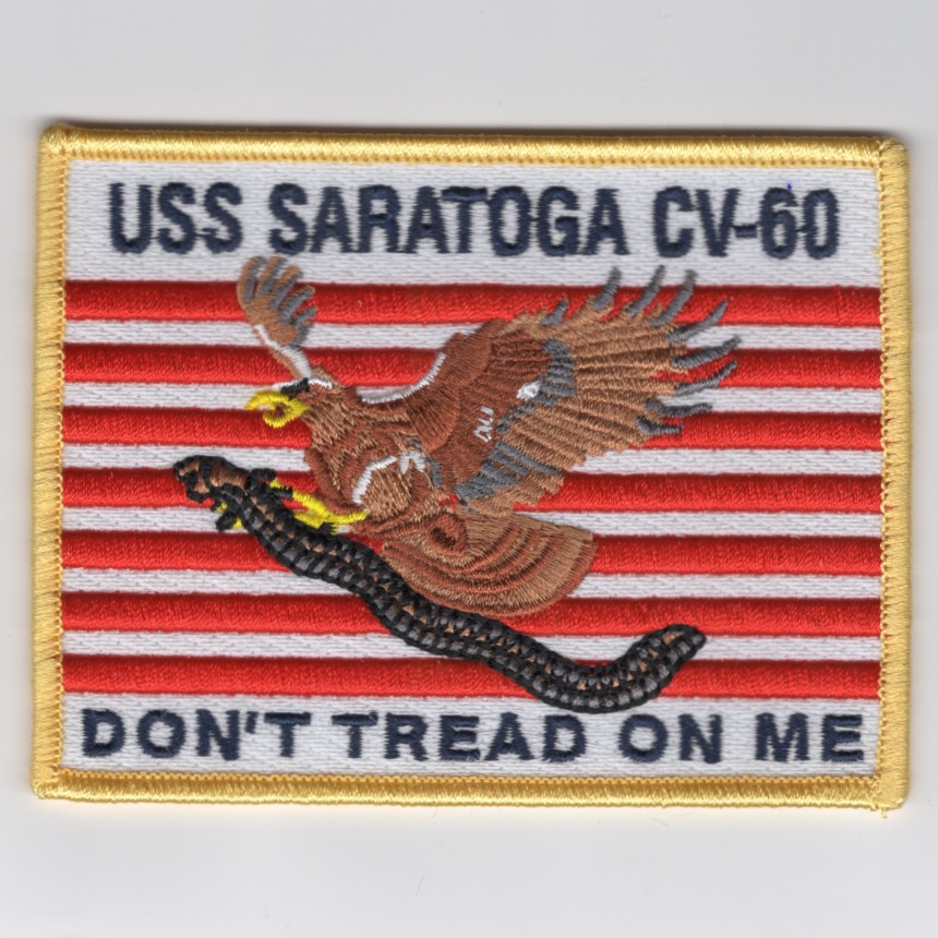 This is the color version of the famous “Don’t Tread on Me” flag worn on the flight suit sleeve by those who served onboard USS SARATOGO (CV-60). A few years ago, a directive from the US Navy was released that these are now an authorized flag that can be worn on their flight suits (unconfirmed). This patch does not come with velcro attached.
