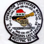 This was the final cruise patch for the USS Ranger (CV-61). She sailed from Vietnam to Desert Storm and carried onboard several different airwings and battle groups. She served from 1957-1993. This is the CVW-2 Operation Southern Watch 1992-1993 WestPac cruise patch.