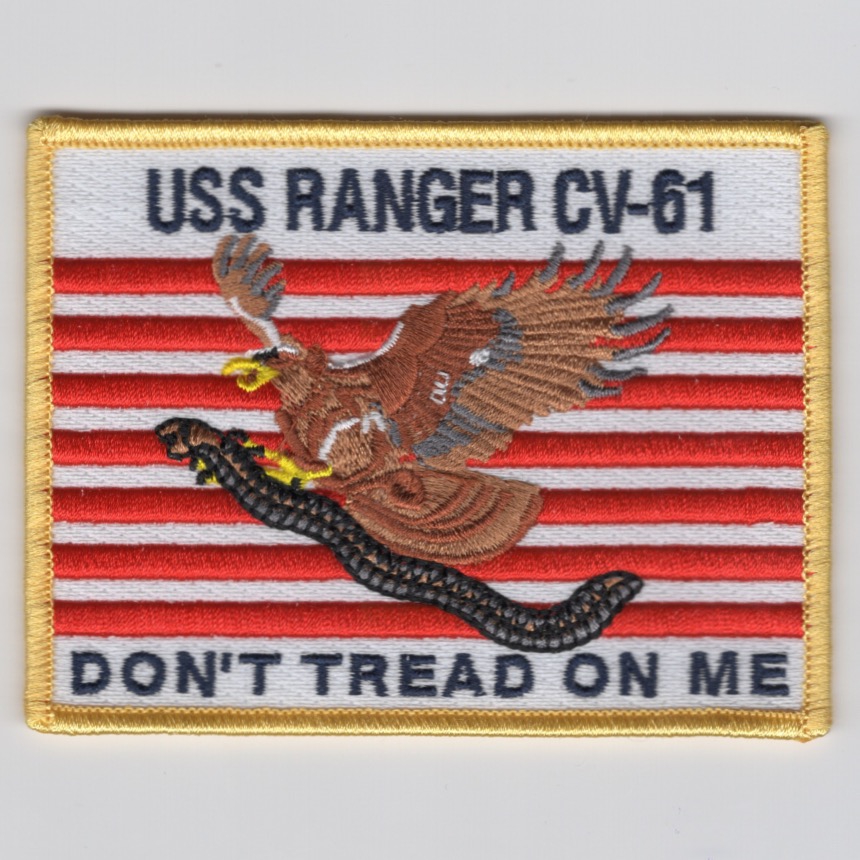 This is the color version of the famous “Don’t Tread on Me” flag worn on the flight suit sleeve by those who served onboard USS RANGER (CV-61). A few years ago, a directive from the US Navy was released that these are now an authorized flag that can be worn on their flight suits (unconfirmed). This patch does not come with velcro attached.