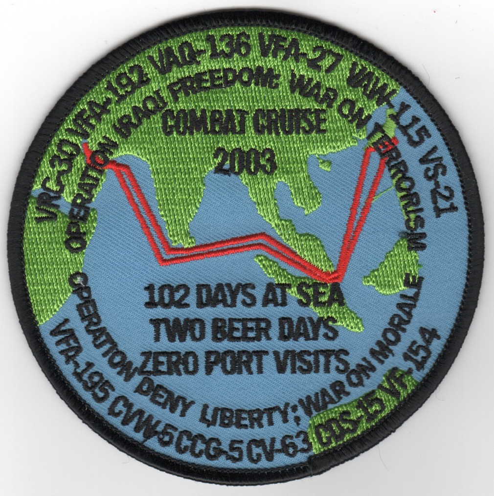 (From Skipper Hagan Collection): This is the “globe” version of the 2003 Operation Iraqi Freedom (OIF) cruise patch for Airwing 5 when they cruised onboard the USS Kitty Hawk. It shows the world with their path in red, and says “102 DAYS AT SEA, TWO BEER DAYS, ZERO PORT VISITS”. In the “HAGAN” collection we picked up, there were several of these with a “rubber band” around them keeping them together. Apparently this is a tough patch to locate, and does not come with velcro attached..
