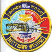 This patch was created by the USS Kitty Hawk (CV-63), CVW-5, and VAQ-136 to commemmorate the 100th anniversary of flight. It depicts an EA-6B and the “Wright Flyer” on the patch.